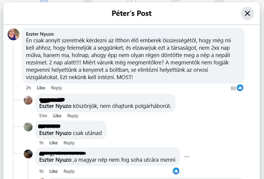 Forrás: Facebook Magyar Péter oldala, a nevet tudatosan hagytam meg, mert nyilvános komment volt